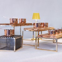 - VS30-002 – Tris di alzate Reverso stilizzate oro con ripiano in legno di ulivo formato da: n°1 alzata 42x22 h 22 cm, n°1 alzata 42x22 h 17 cm, n°1 alzata 42x22 h 12 cm