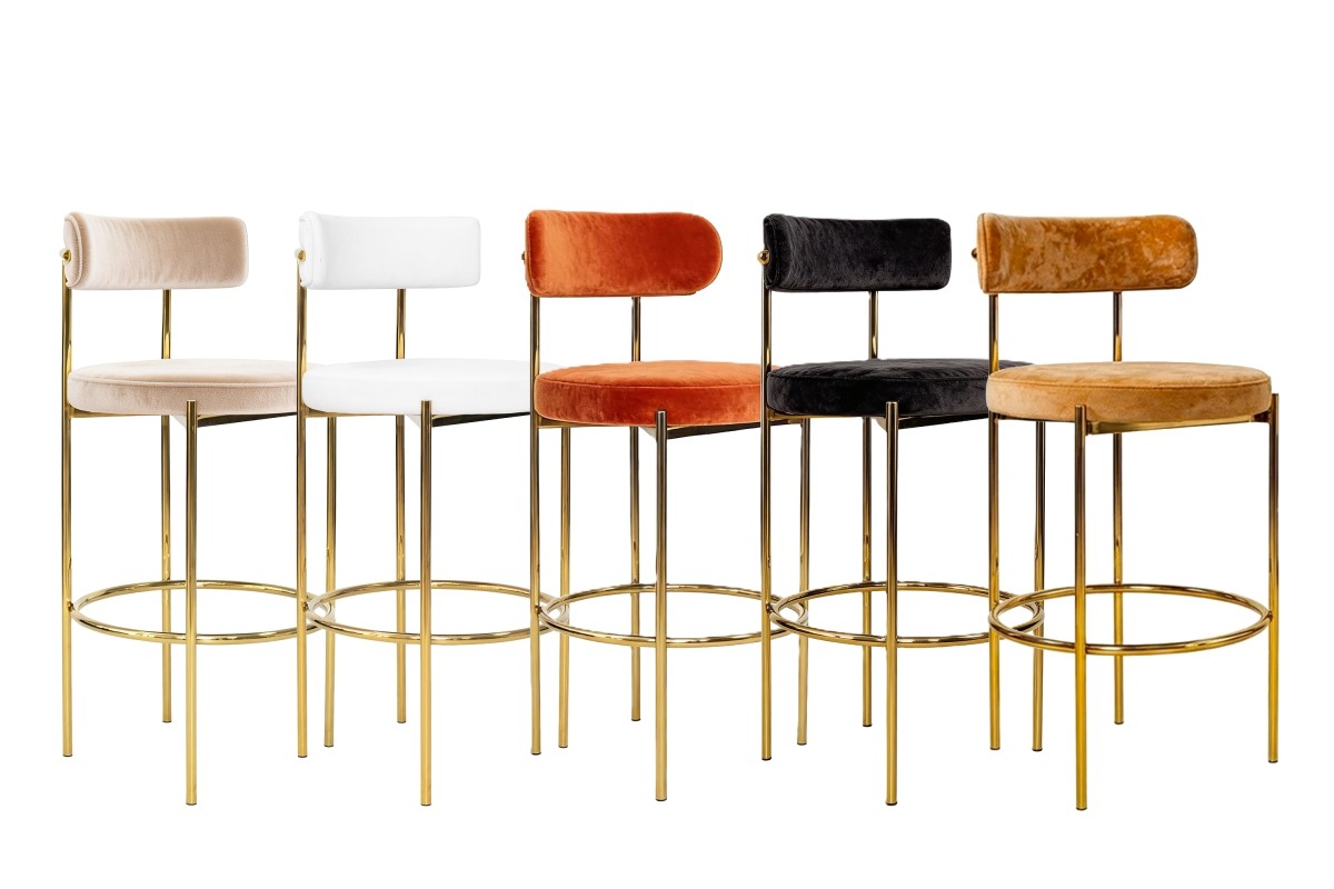 - SE55-005 – Sgabello mod. Jazz in ferro oro e seduta in velluto colore ocra