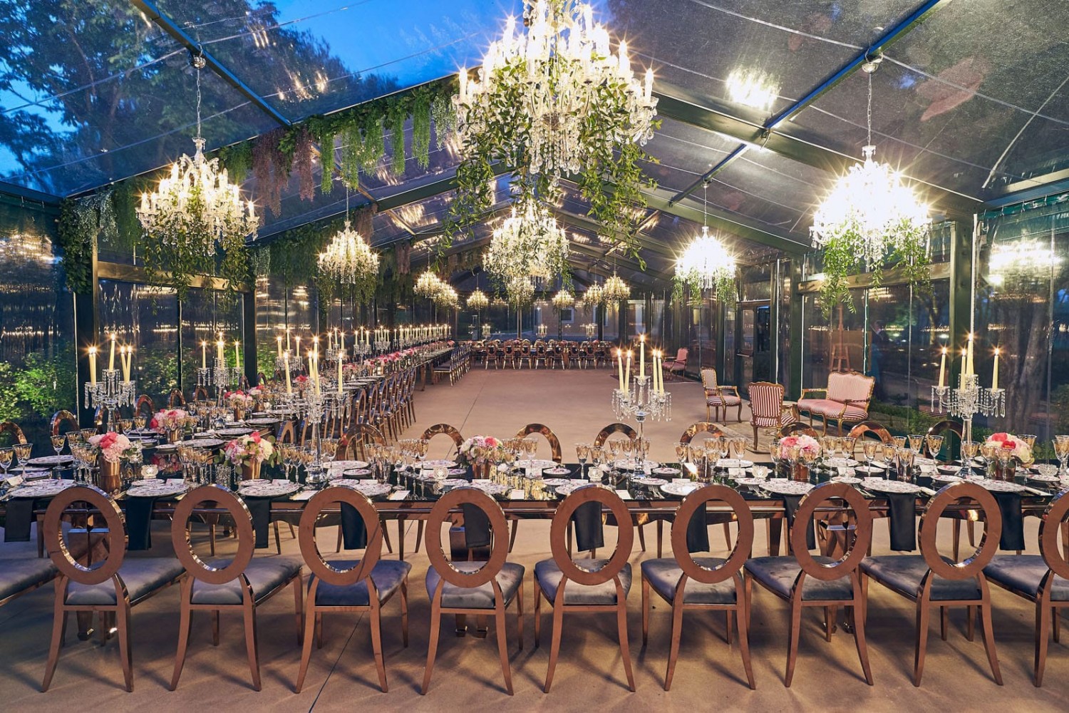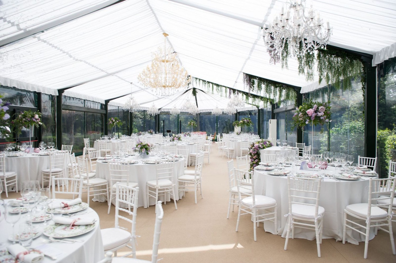 La tendo struttura mod. Cristal con profili laccato verde può essere formata da arcate uniche di 10/15/20 metri, per laprofondità desiderata da un minimo di 10 metri, a aumentare con multipli di 5 metri.Le tendo struttura sono munite di strutture portanti in profili di alluminio laccati verde RAL 6009 tetti in Cristal trasparente in materiale ignifugo, laterali in Cristal in materiale ignifugo, tendaggi in Trevira ignifuga di copertura dei pilastri delle gambe e del perimetro portante.