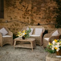 - SA01-001 – Salottino da giardino in vimini con cuscino avorio completo di divano 2 posti, 2 poltrone e tavolinetto