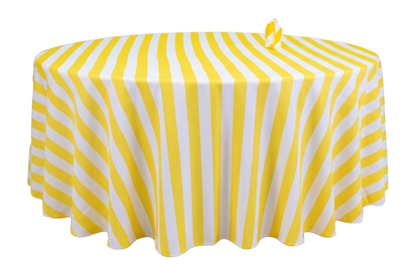 - TG97-001 – Tovaglia rotonda a righe bianco e giallo Ø 3,50 finitura a fettuccia
